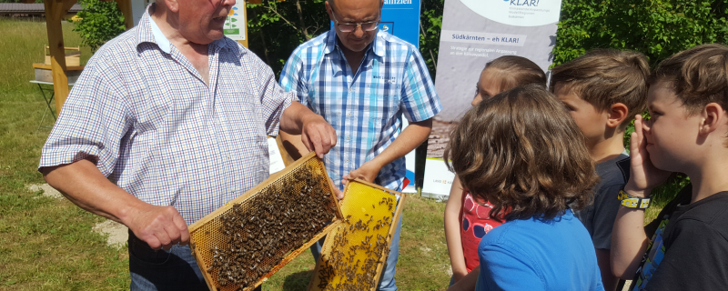 In Kooperation mit der AidA-Gemeinde Gallizien, der Volksschule, dem Imkerverein, und KLAR!-Südkärnten wurde im Schuljahr 2018/19 das Schwerpunktthema „Bienen & Imkerei“ gewählt. Höhepunkt war die Errichtung eines Lehr- & Versuchsbienenstandes auf einer Wiese, welche von der Gemeinde zur Verfügung gestellt wird um die Themen Bienenschutz & Klimawandel möglichst breit zu bearbeiten. Es bedarf engagierter MitstreiterInnen, in diesem Fall die Mitglieder des Bienenzucht-Vereines, die LehrerInnen und SchülerInnen der Volksschule, einer motivierten Gemeinde bzw. eines themenaffinen Bürgermeisters und Imker Harald Jost vom Imkerverein, der in seiner Freizeit Workshops in der Schule abhält und nebenbei für die Gestaltung und Umsetzung des Lehr- und Versuchsbienenstandes hauptverantwortlich ist.