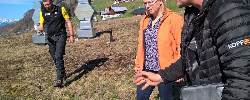 Aber auch auf den öffentlichen Flächen und an Straßenböschungen sollen in Zukunft vermehrt Angebote für die Bestäuber entstehen bzw. stehen gelassen werden. Gemeinsam mit Daniel Meusburger, dem Landschaftsgärtner, der im letzten Jahr das Saatgut von den artenreichen Wiesen der Bauern geerntet hat, schauen sich Allianzbetreuerin Katrin Löning und Monika Bischof die Potentiale in den Gemeinden an. Überall tauchen unter dem Schnee kleinere Baustellen und Rutschungen auf. Hier muss nachgesät, wiederbegrünt werden. Ziel ist es, auf diesen kleineren Flächen Wiesenvegetation zu entwickeln, die nur einmal im Jahr gemäht werden muss, die den Bienen so lange wie möglich zur Verfügung steht. Dies geht nur mit magerem Boden und richtigem Saatgut. Bald folgt eine Lernbaustelle für Gemeindemitarbeitende und Interessierte, wo Wissen ausgetauscht werden kann.